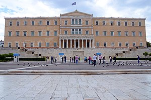 Grikska parlamentsbygningurin á Syntagma Plássinum. Myndin er tikin 17. mai 2012, tá nýggja stýrið tók við, tá fíggjarkreppan leikaði harðast í Grikkalandi.