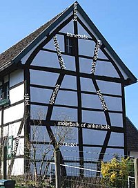 Oetgeleech artikel: Vakwerkhoes E vakwerkhoes is e geboew dat gemaak is van eikehoute of anger soort helhoute belk, tek en leim. De constructie, 't gerièmsj of raomwerk, besjteit oet vakke. In die vakke zeen ouch de vinstere en deure verwirk. Boewe mit hout en leim gebäörde al in d'n tied van de Bandkeramiekers (5000 v.Chr.). De geraemsele van houte belk kaome pas later. Vakwerkhoezer zeen tot in de neugeteenden iew geboewd, mae waorte lank gezeen es teike van ermooj. In d'n twintigsten iew is me vakwerk zjus gaon waardere en zeen väöl auw hoezer gerestaureerd. Laes mie...