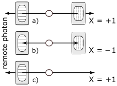- ↑ Here, "virtual" means that no measurement is taken, but since we know the outcome of said measurement by measuring the "remote" photons polarization along that axis, we have what might be called a de facto measurement.