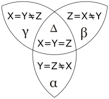 Likewise, P(Y=Z) = P(α) + P(Δ) and P(Z=X) = P(β) + P(Δ). If we add all three, each Δ event gets counted three times: